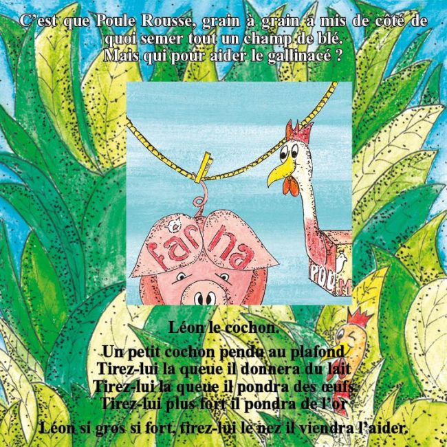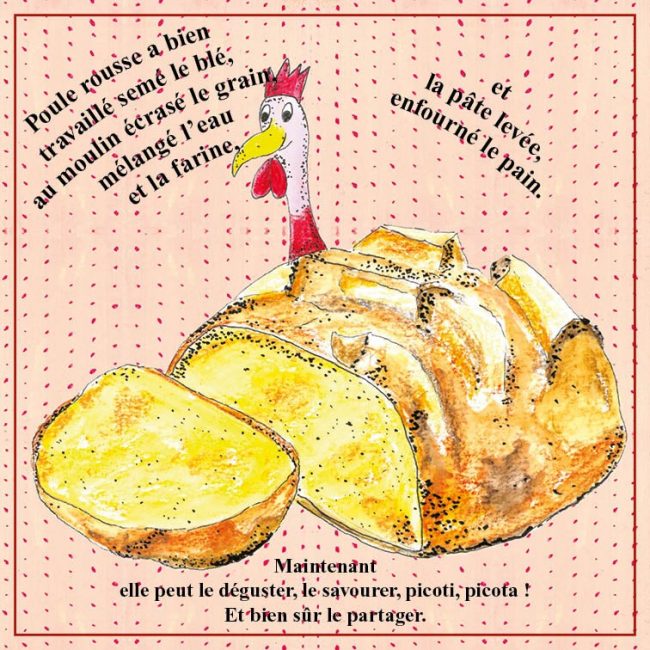 Poule rousse, tout en couleur, tout en labeur, de haute ou de basse-cour, en rien poule mouillée, s’attache à sa tâche. Elle gratte, sème, récolte, pétrit et cuit un pain.