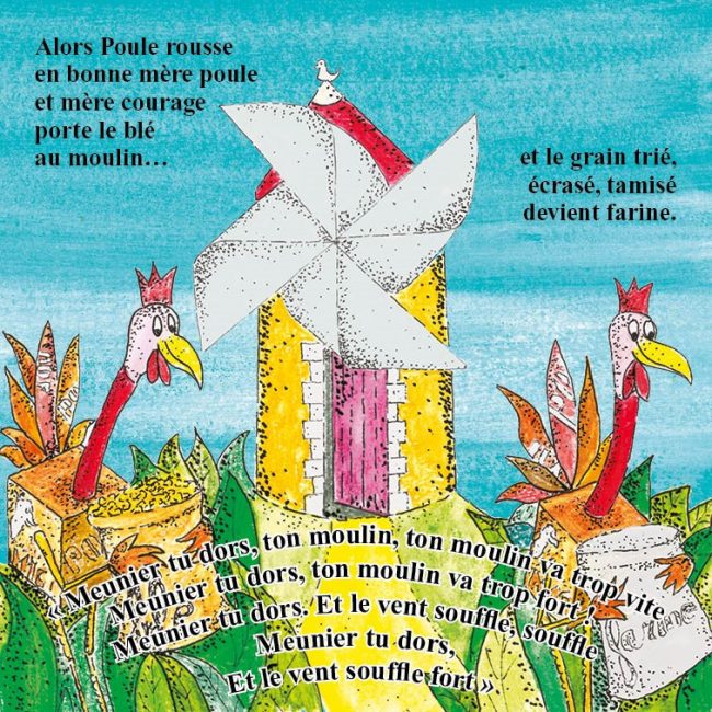 « Ce jour-là, Poule Rousse, mère poule et mère courage décide de semer, cultiver, récolter, un peu de blé afin de pétrir et cuire un pain… »