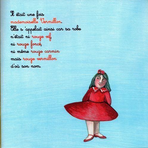 « Il était une fois, mademoiselle vermillon, elle s’appelait ainsi car sa robe n’était ni rouge vif, ni rouge foncé, ni même rouge carmin mais rouge vermillon d’où son nom »