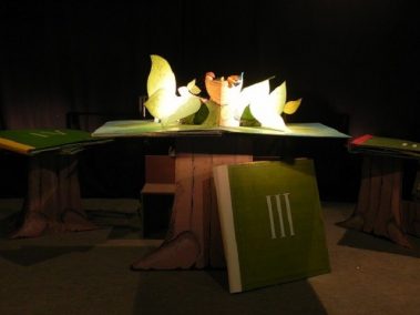 Ce spectacle est présenté en « POP UP », grâce à d’immenses livres animés, les volumes des décors apparaitront et disparaitront comme par enchantement, des constructions insoupconnées se déplieront au service de l’histoire créant la surprise et l’émerveillement chez l’enfant et rappelant aux enseignants les livres animés de leur jeunesse.
