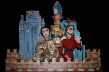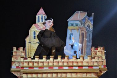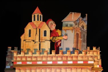 Voici une rare reconstitution, dans l’esprit du Moyen Âge et de la Renaissance, d’un castelet d’épaule ou théâtre porté, utilisé à cette époque.