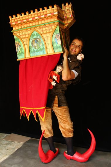 Notre troubadour, bien en vue du public sur son chariot scène, portant sur lui l’ensemble des burattinis (marottes) et accessoires, épaulera son castelet, tel un homme orchestre, afin de jouer farces et fabliaux issus du répertoire du XII et XIII siècle.